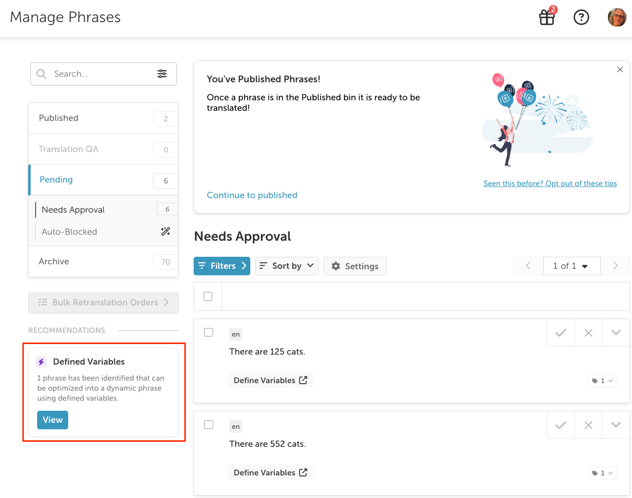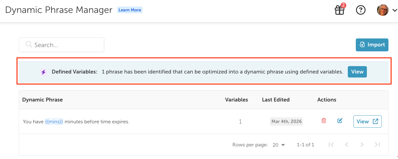 When new dynamic phrase candidates are found, a prompt will be shown on the Manage Phrases page.