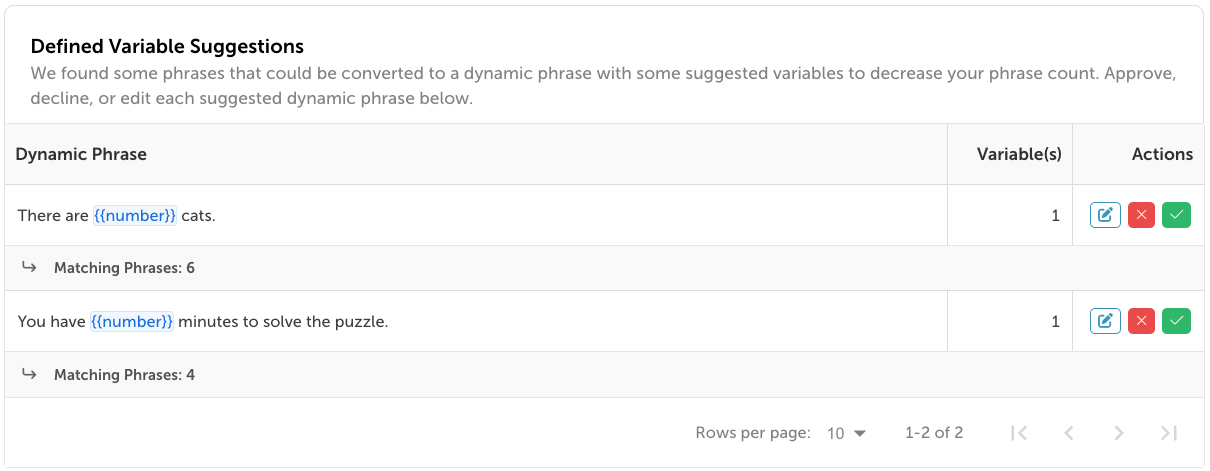 As part of our AI Agent bundle, Localize offers the Suggested Dynamic Phrases feature. This will automatically search for patterns in your phrases and will suggest dynamic phrases you can add.