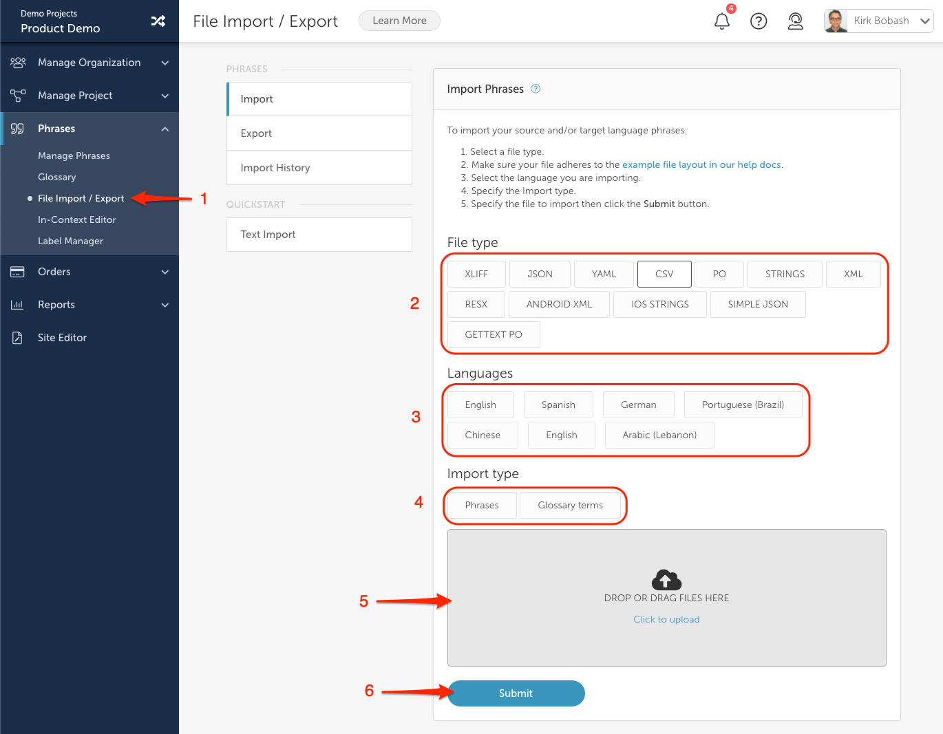 Within the Localize dashboard we provide you with an ability to import and export phrases and translations in various file formats.